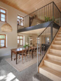 Das Gebäude besteht aus einem historischen Wohntrakt und einer ehemals landwirtschaftlich genutzten Tenne, die neu als Kulturraum aktiviert wurde. Der räumliche Ausbau folgt einer Struktur der minimalen Intervention: Neue Grundrisslösungen wurden dort eingeführt, wo sie notwendig waren, ohne die Lesbarkeit der ursprünglichen Bauform zu beeinträchtigen. Der Wohnbereich bietet heute zwei eigenständige Einheiten, die jeweils auf großzügige, gemeinschaftlich genutzte Flächen Bezug nehmen. Der Kulturraum im Dachgeschoss der Tenne kann als Veranstaltungsraum für Konzerte, Vorträge oder gemeinschaftliche Aktivitäten genutzt werden. Die Räume sind funktional einfach, mit guter natürlicher Belichtung, klarer Erschließung und robuster Materialisierung. Der Umbau berücksichtigt unterschiedliche Nutzungsintensitäten, saisonale Anforderungen sowie eine niederschwellige Umnutzung – so konnte ein Haus mit Geschichte auf zeitgemässe Weise in das soziale und kulturelle Leben des Ortes eingebunden werden.