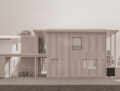 Das geplante Einfamilienhaus in Nofels überzeugt durch eine klare, funktionale Architektur und den Einsatz regionaler Materialien. Das Haus orientiert sich an den örtlichen Gegebenheiten: Durch die bestehende Bebauung im Osten wurde eine kompakte Bauweise für eine Nachverdichtung gewählt. Ein niedriger Zwischenbau verbindet Neu- und Bestandsbau, dient als Haupteingang und führt über eine sanft ansteigende Rampe in den Garten. Eine südseitige Terrasse erweitert den Wohnraum und bietet einen gemeinsamen Treffpunkt im Freien.