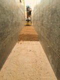 Kern der Anlage ist eine 40 bis 70 Meter lange Schalung, entlang derer die komplexe Maschine auf Laufschienen verfahrbar ist. Zentraler Bestandteil ist der Beschicker, der das Stampflehmmaterial aufnimmt und über ein Querförderband lagenweise in die Schalung einbringt und auf Höhe abzieht. Direkt dahinter sorgen Vibrationsplatten für eine Vorverdichtung der Lehmschicht. Anschließend übernehmen sehr starke, ungedämpfte pneumatische Handstampfer auf einer schwenkbaren Halterung das endgültige Verdichten.